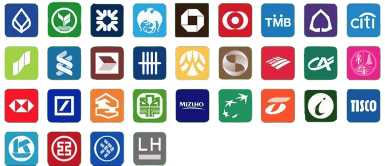 กสิกรไทย (KBank), ไทยพาณิชย์ (SCB), กรุงเทพ (BBL), กรุงไทย (KTB), กรุงศรีอยุธยา (BAY), ทหารไทยธนชาต (TTB), ยูโอบี (UOB), ธนาคารไทยเครดิต, เพื่อการเกษตรและสหกรณ์การเกษตร (BAAC), ออมสิน (GSB), อาคารสงเคราะห์ (GHB) และอื่นๆ